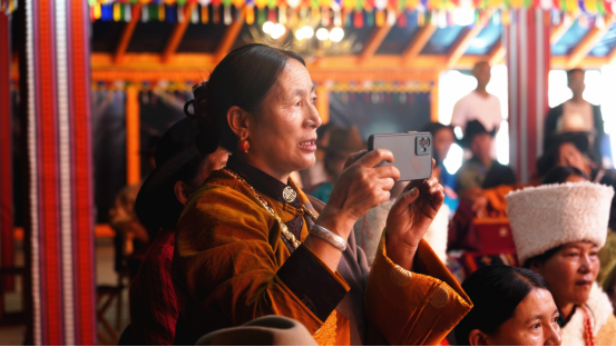 9号大帐内抑扬顿挫的曲调吸引众多游客前往大帐观看欣赏,大家拿出手机纷纷拍照留念,帐内工作人员热情地为大家倒上热腾腾的酥油奶茶,为远道而来的客人洗尘解乏。